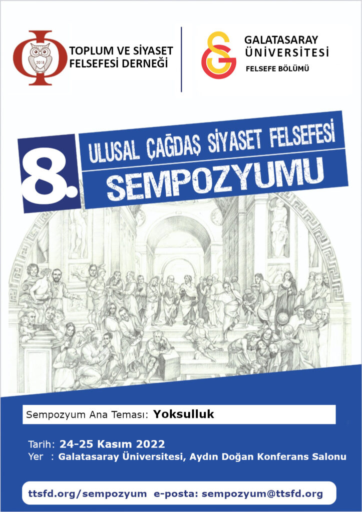 Bu doğrultuda bu sempozyum, yoksulluk problemini herhangi bir noktasından yakalayabilecek tüm tartışmalara ve tüm alanlardan gelecek katılımcılara açık bir çağrıda bulunmaktadır. Etik, siyaset bilimi, toplum ve siyaset felsefesi, sağlık, ekonomi, sosyoloji, tarih, eğitim ve politikanın tüm alanlarından katılımcıları 24-25 Kasım 2022 tarihlerinde Toplum ve Siyaset Felsefesi Derneği ve Galatasaray Üniversitesi Felsefe Bölümü iş birliğiyle düzenlenecek olan “YOKSULLUK” temalı sempozyuma davet ediyoruz.