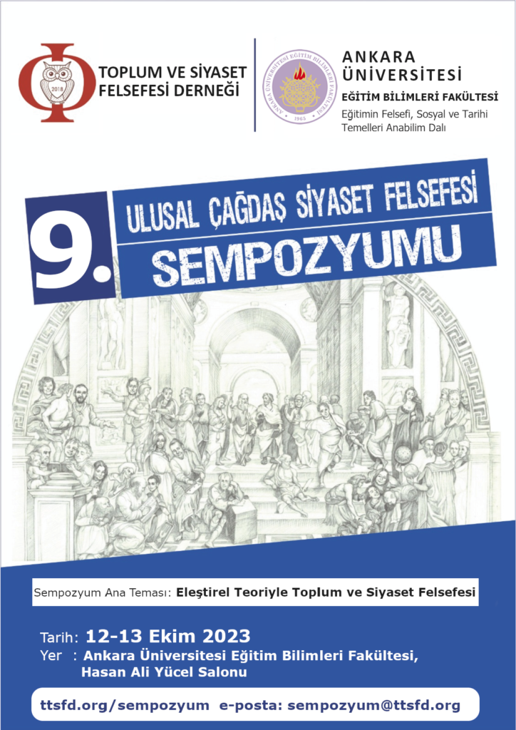 Farklı disiplinlerden katılımcıları 12-13 Ekim 2023 tarihlerinde Toplum ve Siyaset Felsefesi Derneği ve Ankara Üniversitesi, Eğitim Bilimleri Fakültesi Eğitimin Felsefi, Sosyal ve Tarihi Temelleri Anabilim Dalı iş birliğiyle düzenlenecek sempozyuma davet ediyoruz.